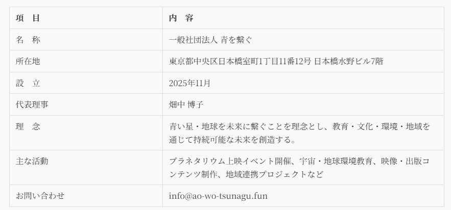 星々・地球・宇宙を通して、教育と文化を育み、環境への貢献を重ね、地域に根ざしたプラネタリウムの活用と持続を図ることで、青い星の持続可能な未来を創造していきます。